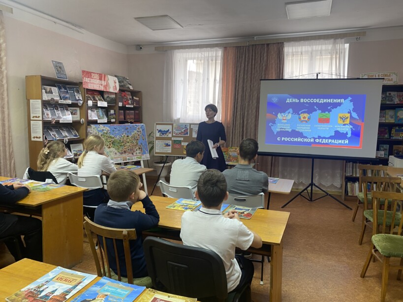 Для читателей среднего школьного возраста в детской библиотеке прошел литературно-музыкальный час, посвященный Дню воссоединения России и ДНР, ЛНР, Запорожской и Херсонской областей.