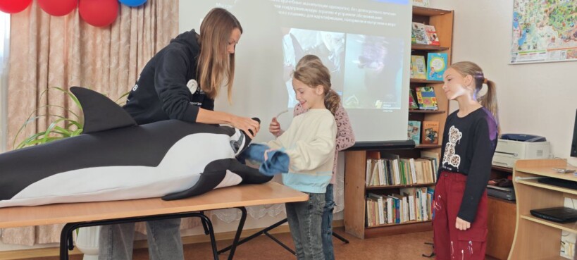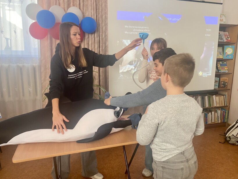Самым интерактивным и запоминающимся моментом встречи стал мастер-класс по оказанию первой помощи дельфинам. И помогал в этом не кто иной, как самый настоящий дельфин… по имени Сева! Конечно, Сева – это плюшевый помощник Елены, но с его помощью ребята научились очень важному навыку – как правильно поить дельфина во время операции по спасению.